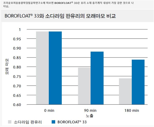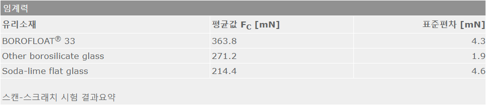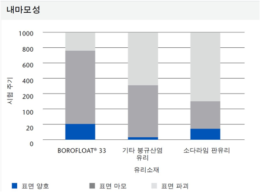 - BOROFLOAT®는 마모나 긁힘에 강하고 굽힘 강도가 높아 기계적 안정성이 우수합니다.