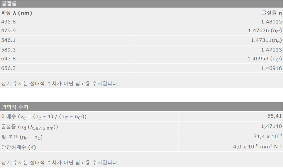 - · 가시 광선, 근적외선 및 UV 파장 범위에서 높은 투명성